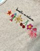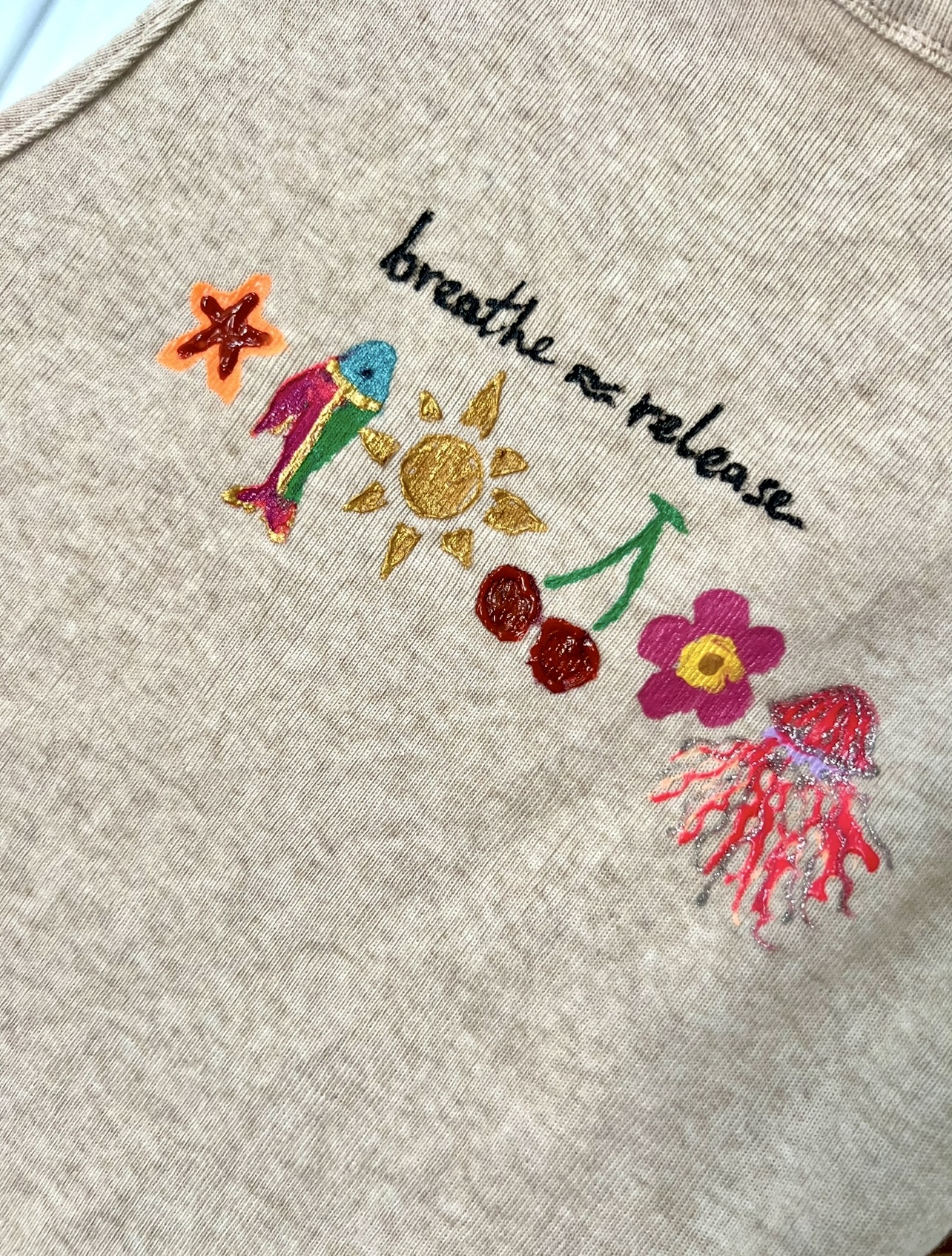 A beige hand painted tank top, with a vibrant art detail.