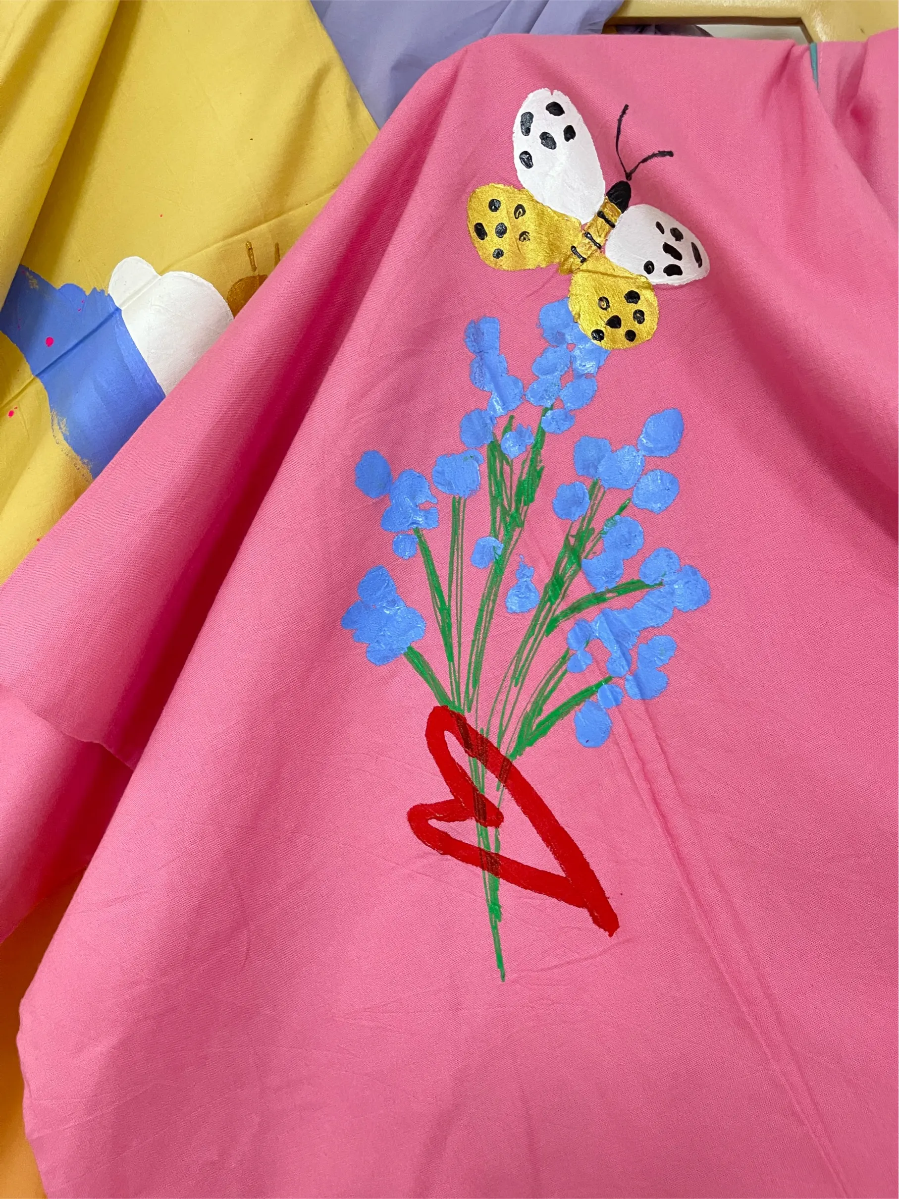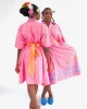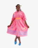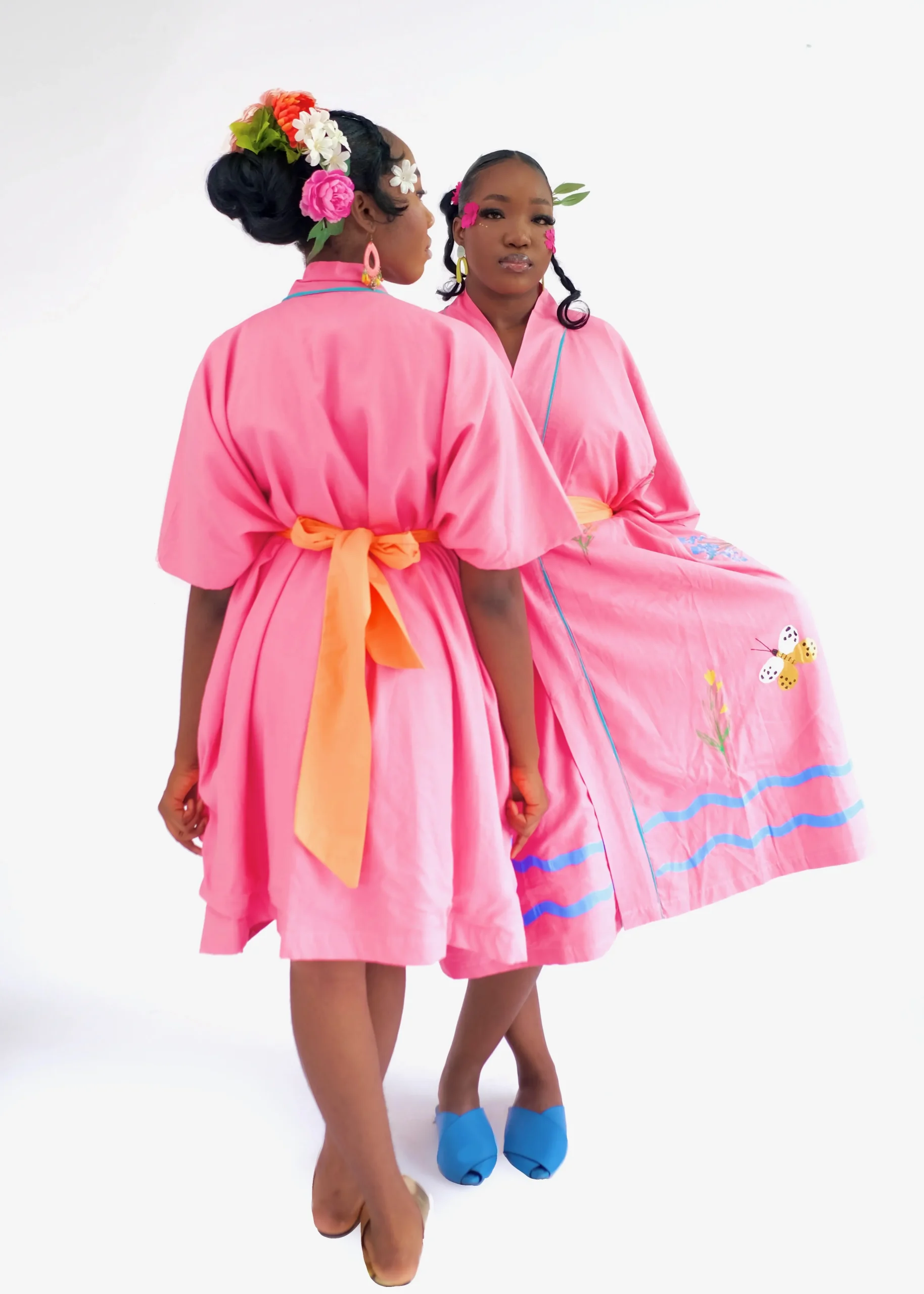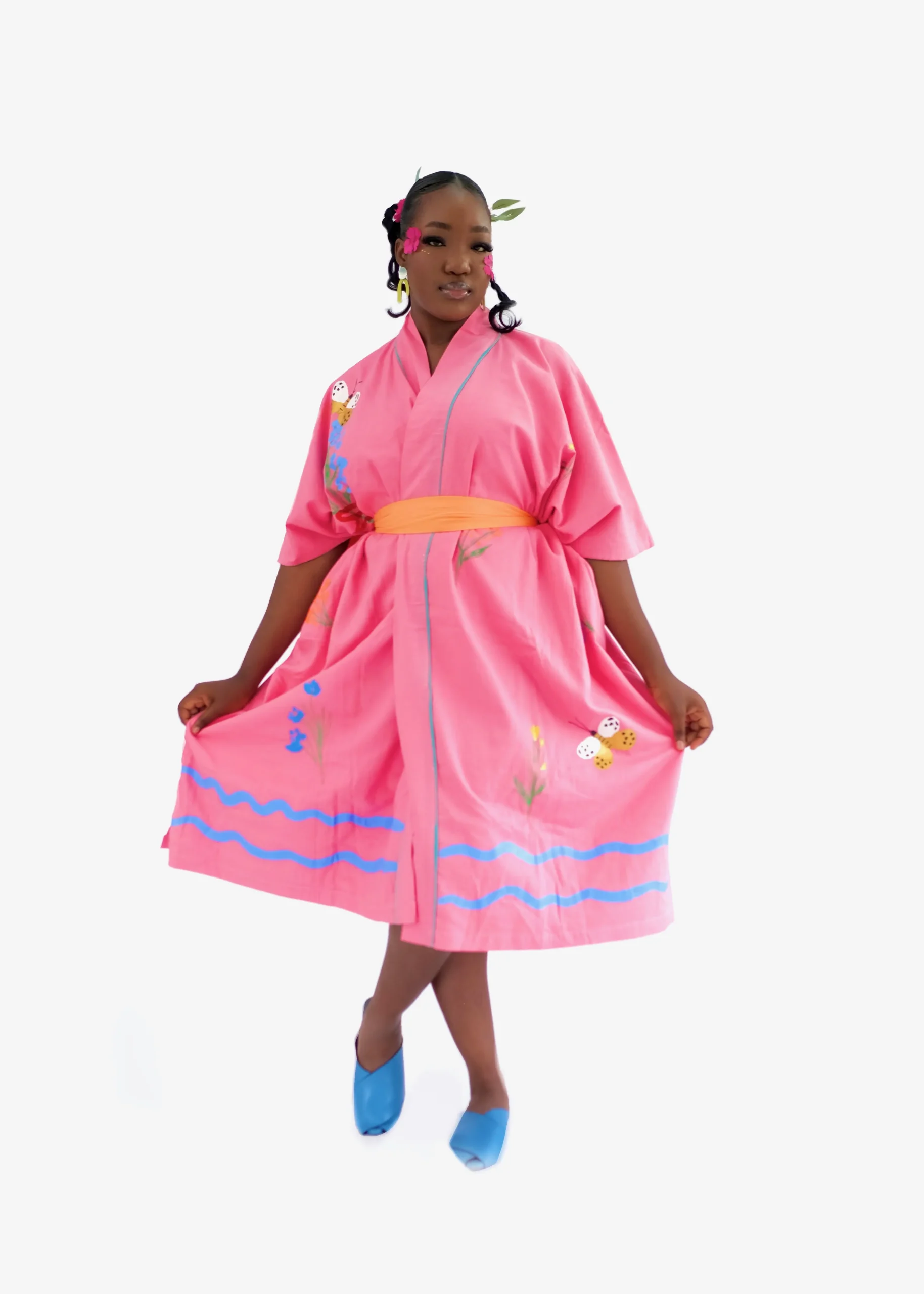 Coral Hand painted kimono that features side pockets with orange sash for multi styling.