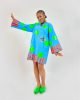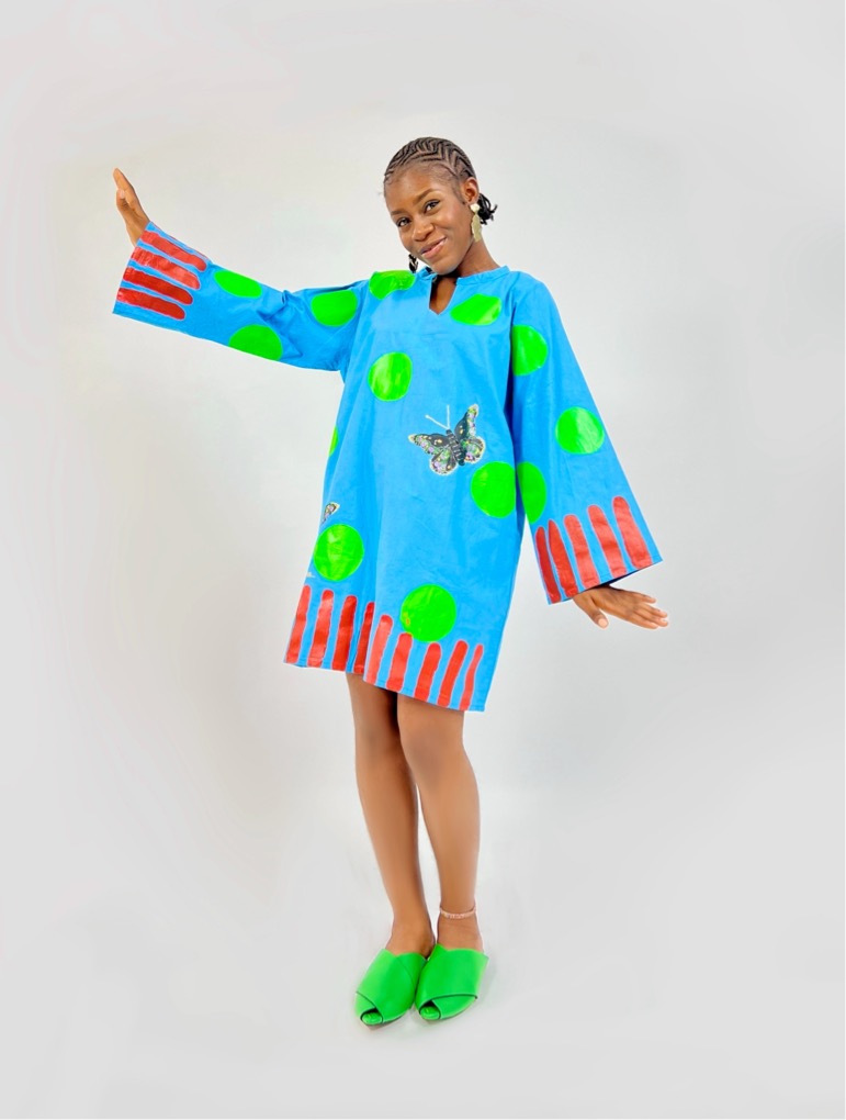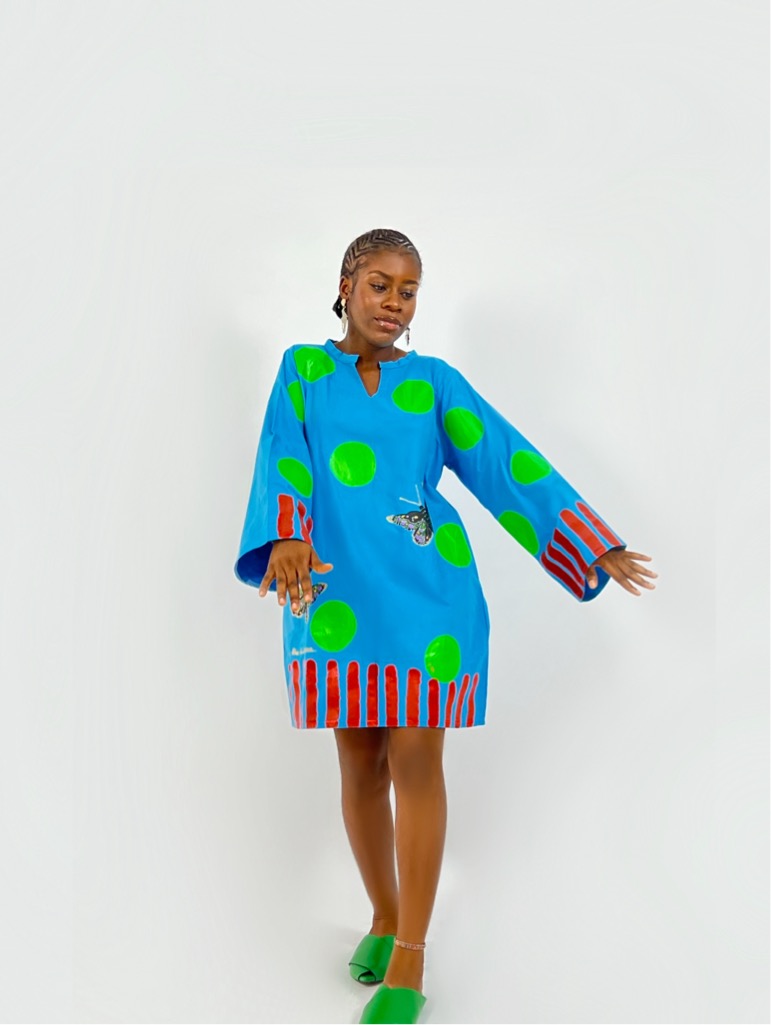 Blue cotton shift dress with butterflies detailing and side pockets.
