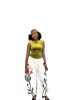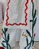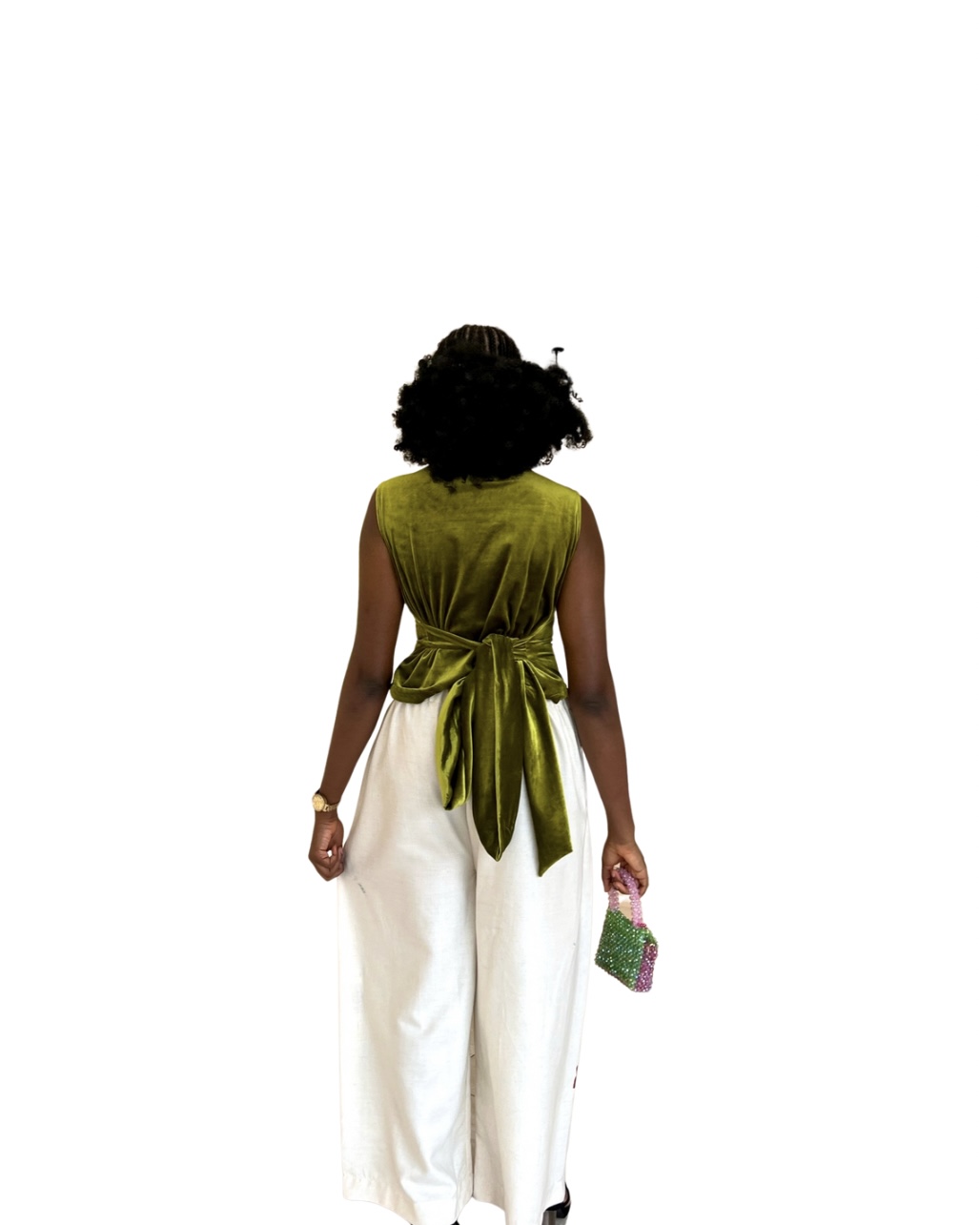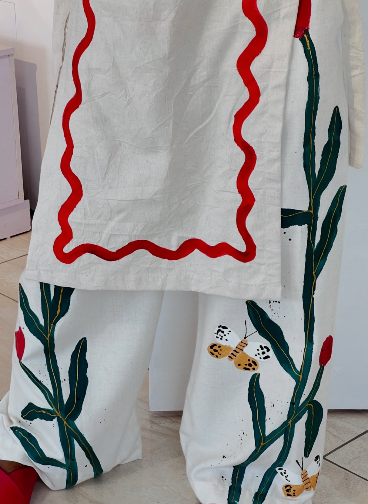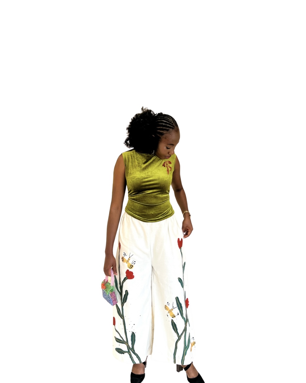 Hand-painted beige mid-weight linen pants which feature an elastic waistband and side pockets.