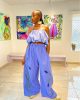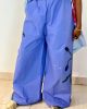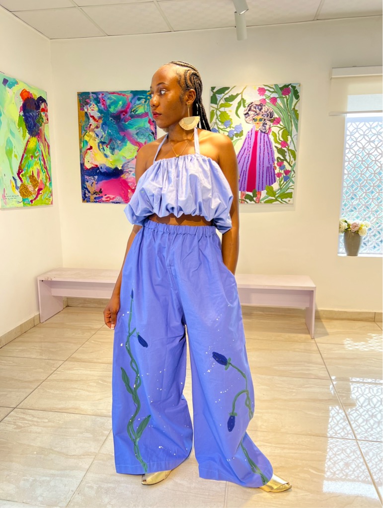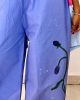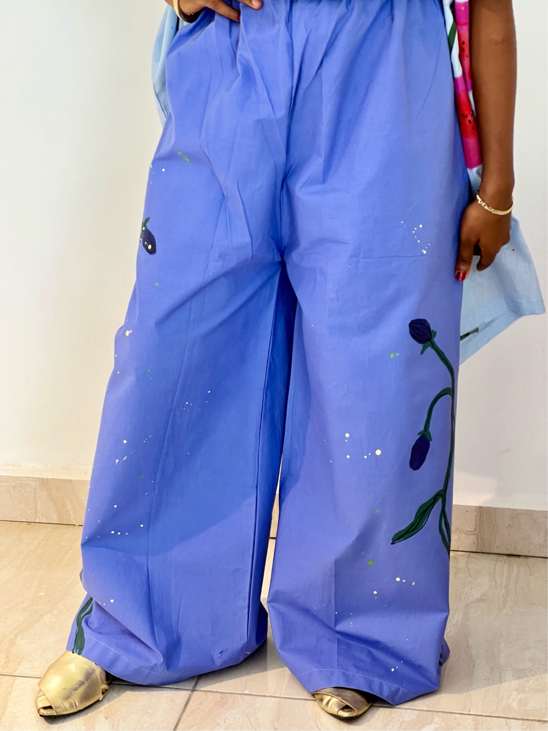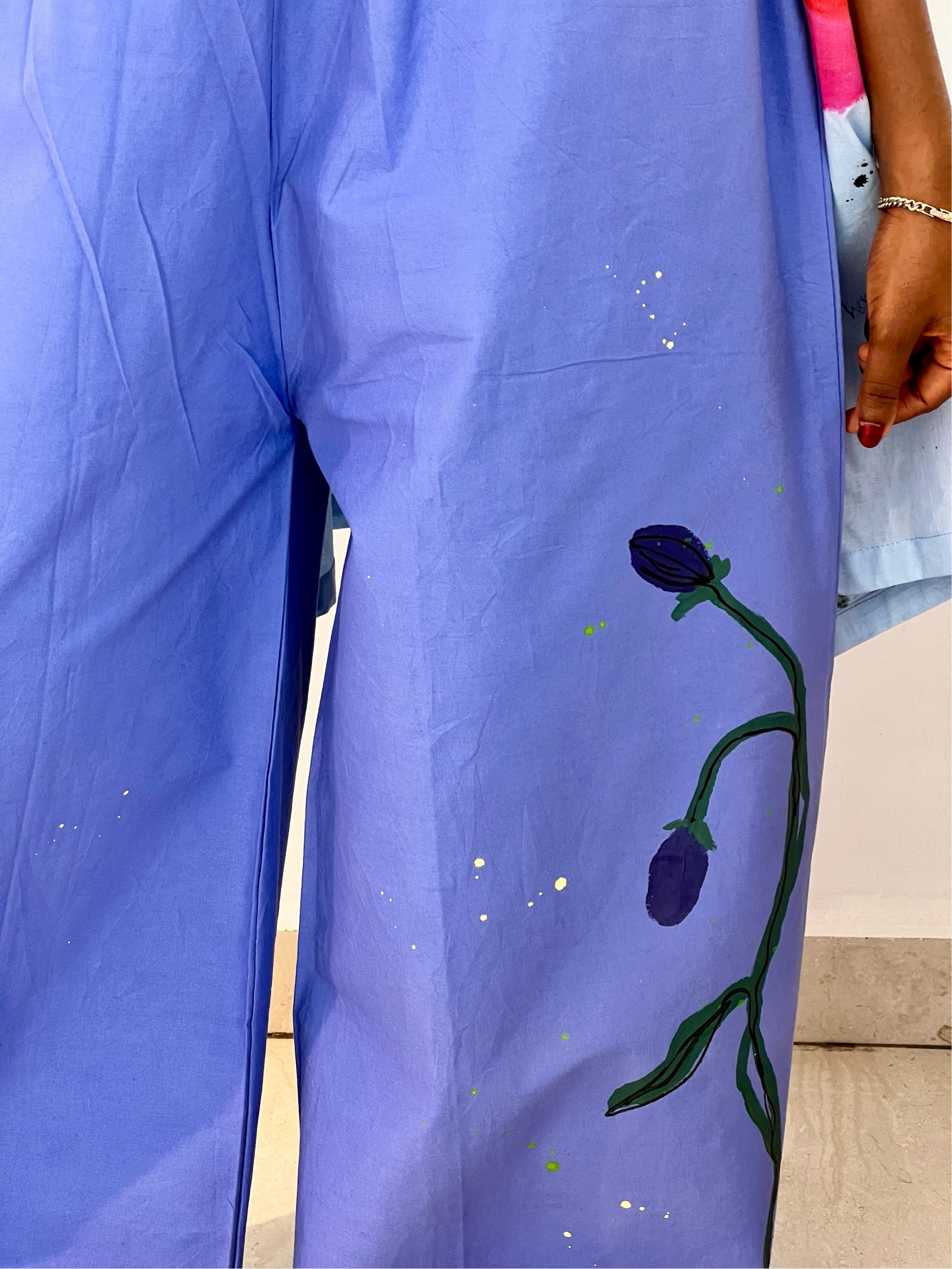 Oversized cotton denim blue pants with vibrant hand painted art details and side pockets.