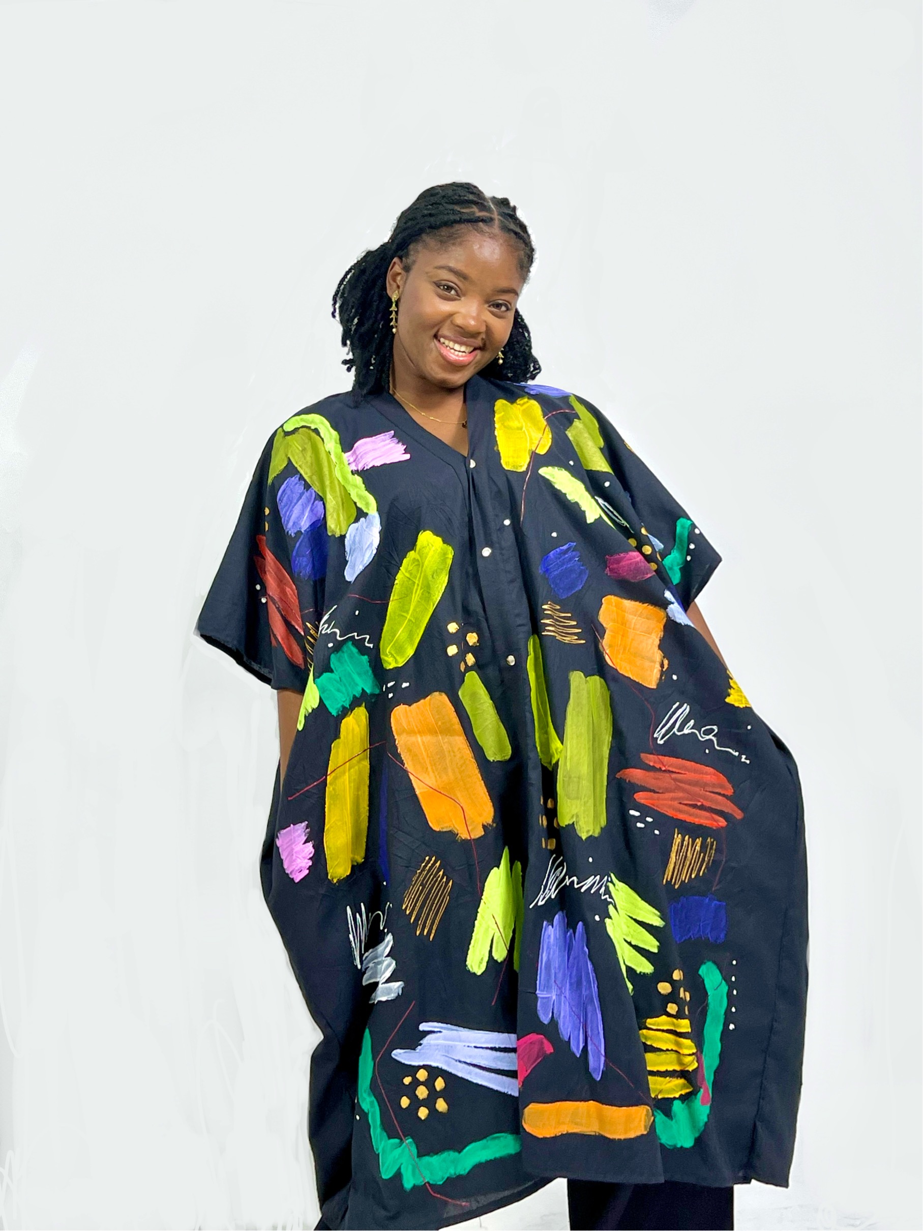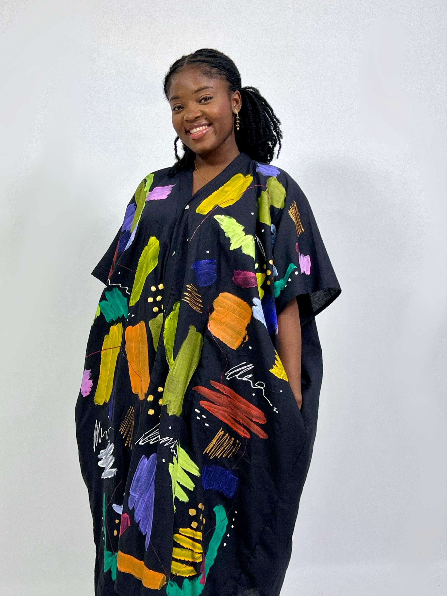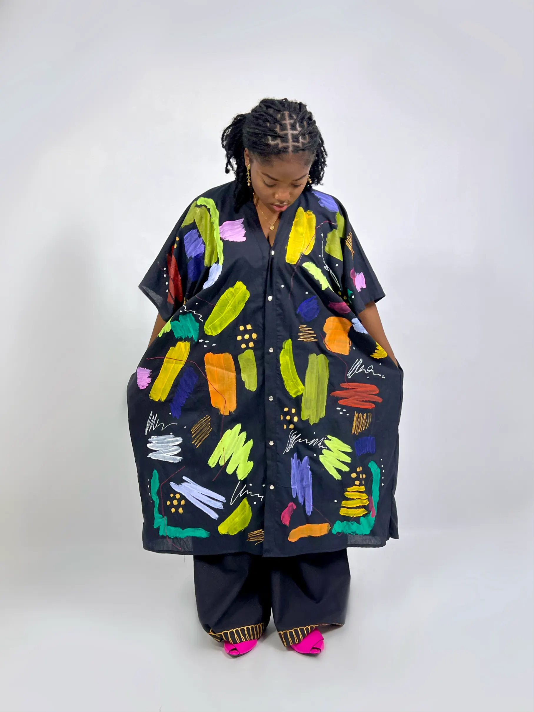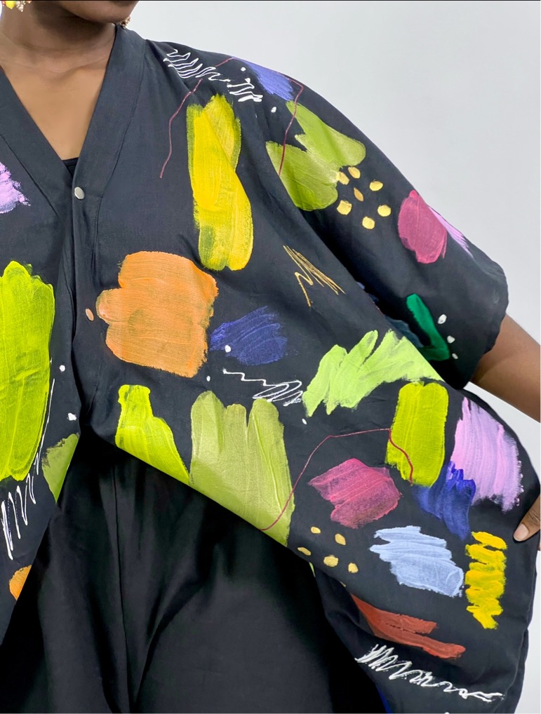 Black linen kimono with press buttons and side pockets, paired with black cotton pants with an elasticated waistband and side pockets.