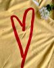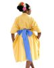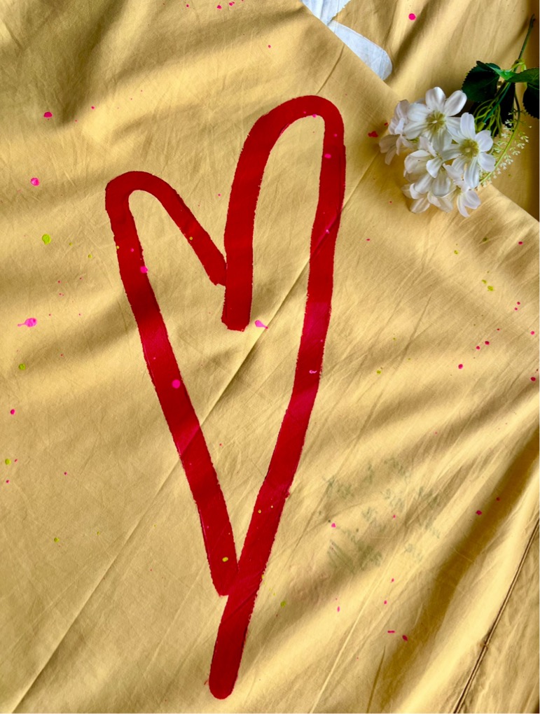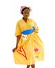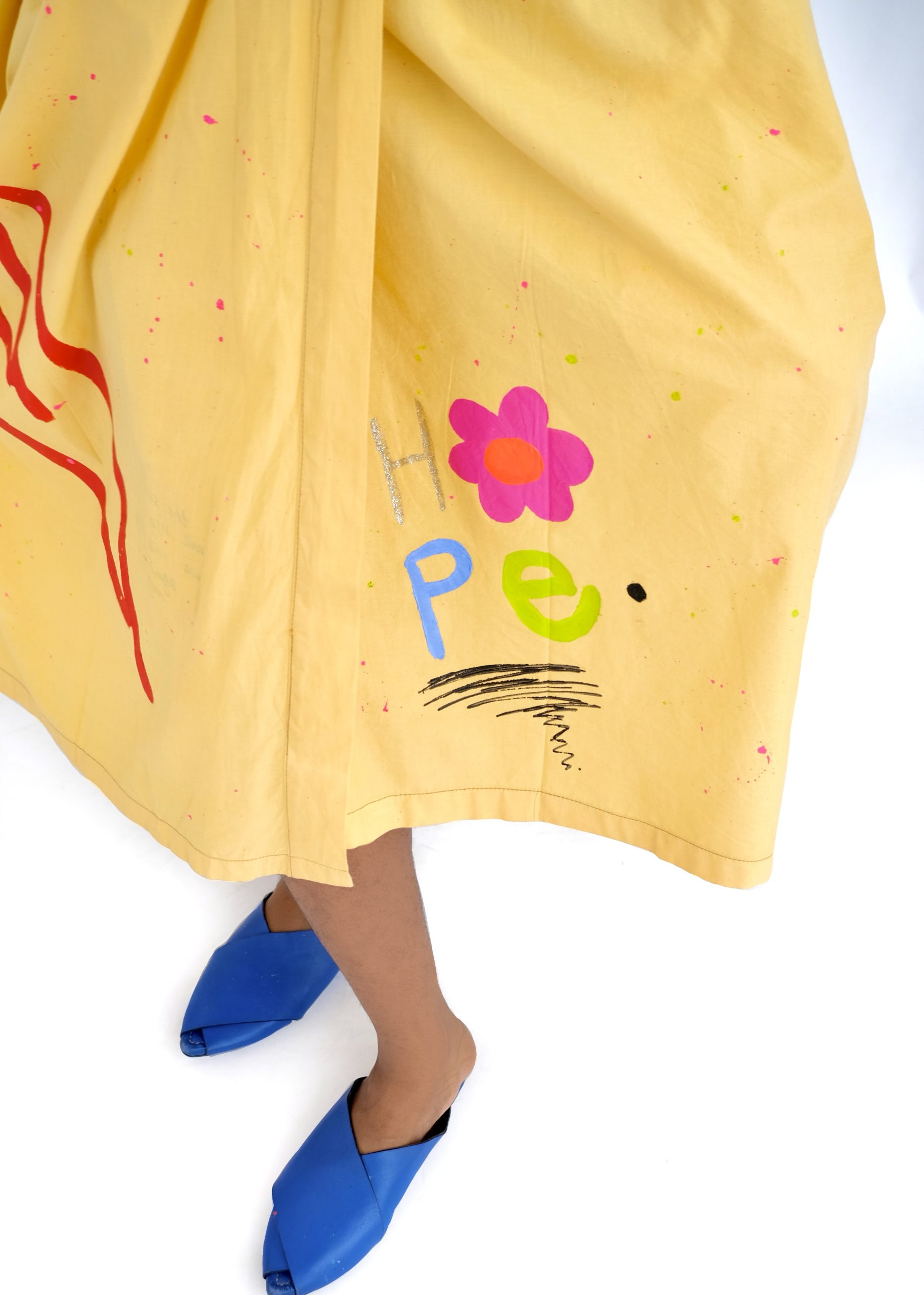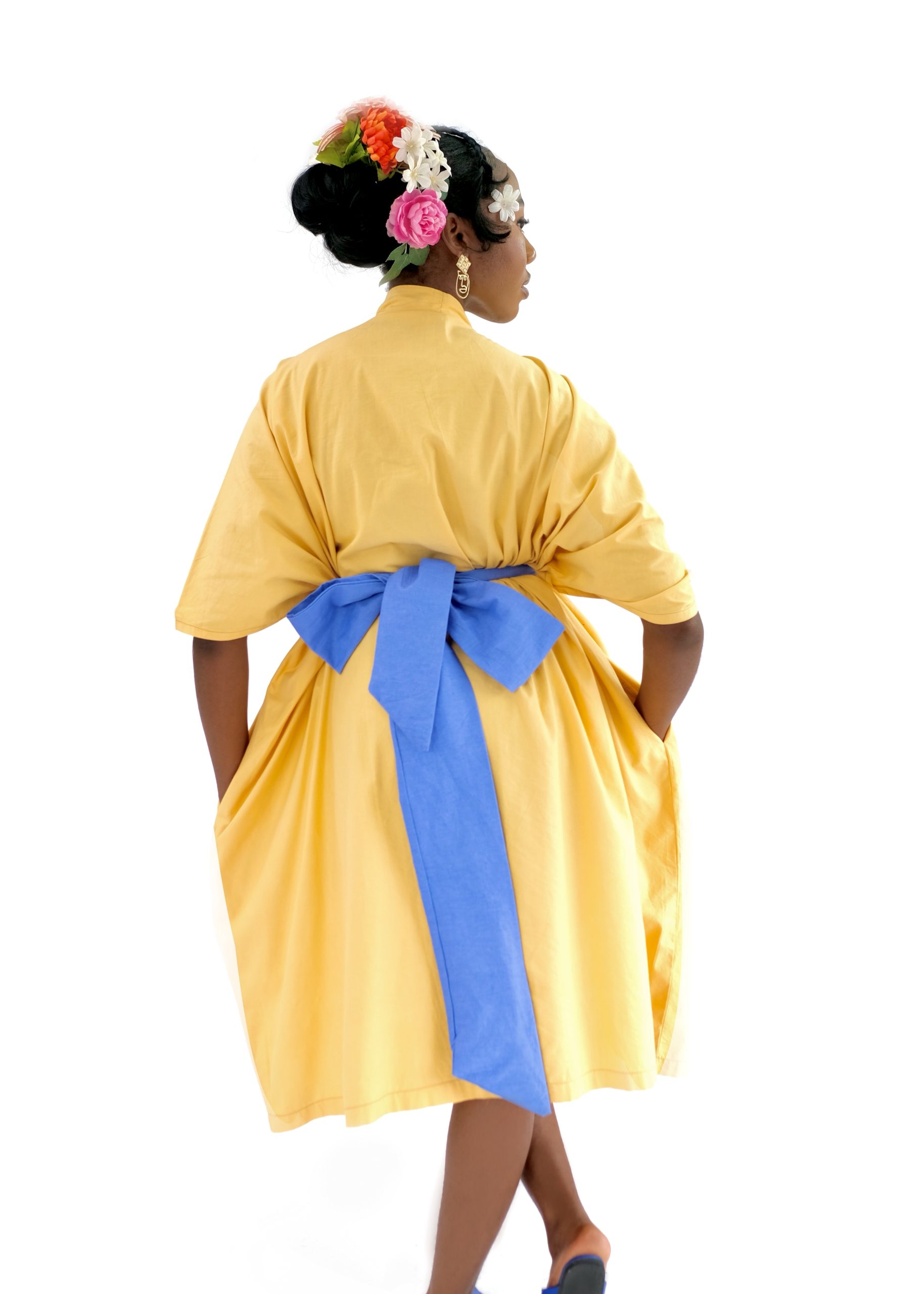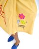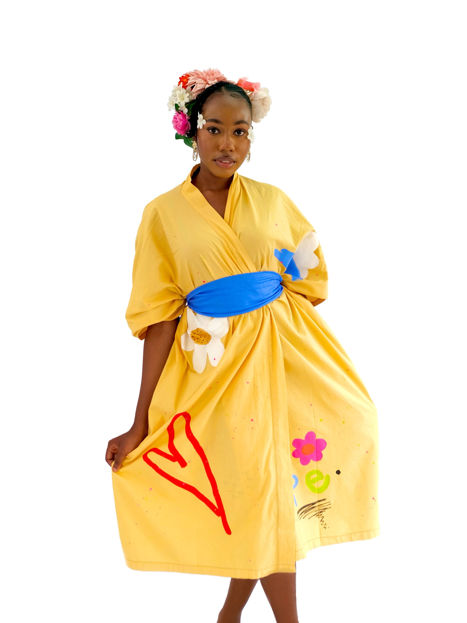 Yellow cotton kimono with side pockets and handprinted art detailing.